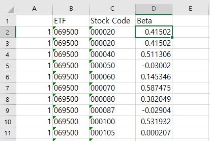 결국 정리해서 좀 쓸만하다는 생각이 드는 기울기 = 베타값만 모아서 정리를 해 보았습니다. 이렇게 하는 것으로 일단은 어떻게 하기는 했는데, 아무튼 간에 쓸만하다는 생각이 드는 결과물을 모으기는 모아 보도록 했습니다. 이제 다음 포스팅에서 이걸 어떻게 요리했는지에 대해서 다루도록 하겠습니다.