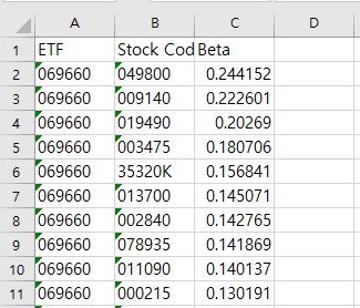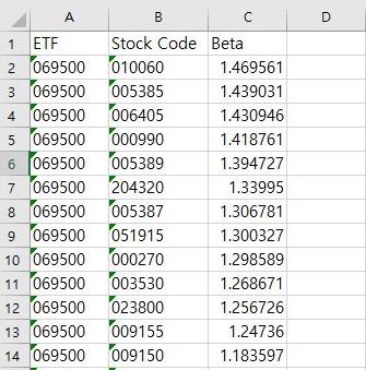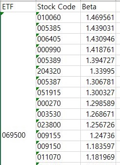 그리고 나서 각각의 ETF별로 모아놓은 다음에 베타값을 내림차순으로 정렬하니까, 드디어 어느정도 쓸만하다 싶은 정도로 베타의 값이 나오는 것을 확인할 수 있었습니다.