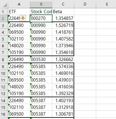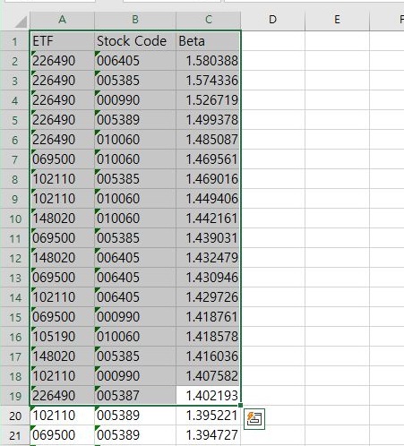 그래서 이전과는 다르게 베타값의 커트라인을 한번 올려보도록 했습니다. 이렇게 해서 올려서 1.4 이상인 값만을 어떻게 해서 가지고 가도록 했습니다.