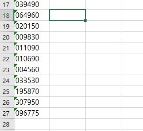 일단 이런 상황에서 중복된 값을 포함해서 27개의 종목 코드가 나왔는데, 이대로는 어떻게 해서든 그냥은 건너가기 어렵기 때문에, 하는 수 없이 엑셀의 중복된 값 제거를 써보도록 합니다.