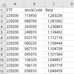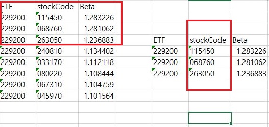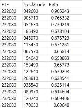 그렇게 해서 일단 ETF별로 모아놓은 다음에 베타를 기준으로 해서 내림차순으로 정렬을 해 주는 것으로 시작할 수 있었습니다.