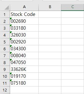 먼저 기존에 있던 데이터의 순서를 오름차순으로 바꾸어서 한번 작업을 해 보고도록 합니다. 이렇게 해서 종목코드를 고르는 작업에 들어갑니다.