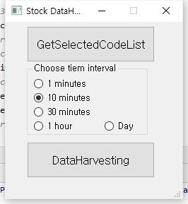 그리고 나서 위 스크린샷처럼 일단 10분봉 차트를 가지고 오도록 해 봅니다. 이를 위해서 데이터 하베스터를 작동 시킵니다. 아, 그리고 시간절약을 위해서 지난번에 나온 후보 종목만 가지고 하도록 합니다.