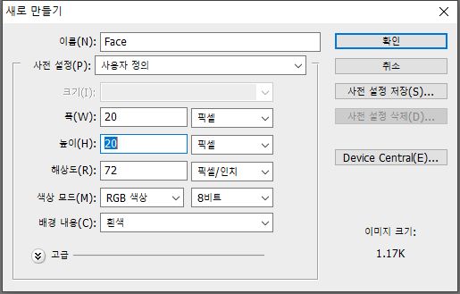 역시나 새로운 프로젝트를 시작하기에 앞서서 위 스크린샷에서 볼 수 있는 것처럼, 일단 20 X 20 픽셀로 사이즈를 만들어서 그림을 그려 보도록 합니다.
