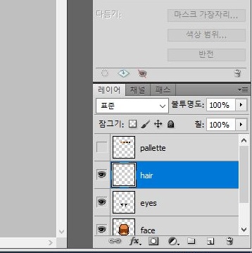 일단 팔레트 역할을 할 레이어를 하나 더 만들어 주었습니다. 이렇게 하는 것이 좋기는 좋은데, 문제는 얘네를 가지고서 어떻게 색상을 지정할 것이냐 하는 문제가 남아 있습니다. 일단 색상에 대해서는 갈색이나 검은색 계통은 도저히 자신이 없어서, 어떻게 해야 할지 모를 상황입니다.