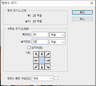 이미지를 늘려 주기 위해서 기존의 20 X 20픽셀에서 32 X 32 픽셀로 바꾸어 주는데, 위 스크린샷처럼 만들어 주도록 합니다.