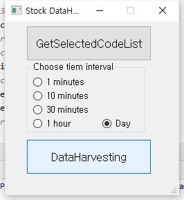 그리고 나서 data harvester를 작동시키는 데 있어서, 위 스크린샷에서 볼 수 있는 것처럼 일단 일봉 차트를 가지고 올 수 있도록 만들어 줍니다.