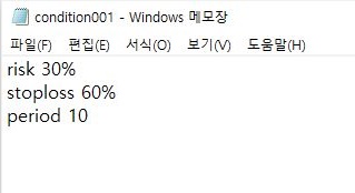 그래서 일단 condition001이라고 해서 손절매를 60%로 과감하게 내리고 나서, 한번 작업을 해 보고자 합니다. 이 테스트에서 어느정도 쓸만한 결과나 나오는지에 대해서 한번 이야기를 해 보고자 합니다.