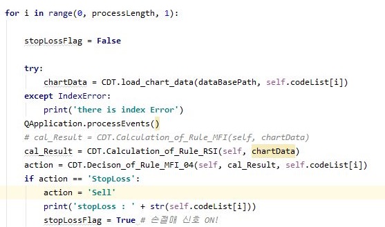 다음으로는 역시나 RSI를 기반으로 해서 나오는 룰에서 이 지수를 가지고서 어떤 액션을 취할지에 대해서 결정하는 메서드를 만들어 줍니다. 다만, 손절매 부분이 상당히 중요하기 때문에, 상황에 맞게 변형시킨 다음에, 이 코드를 이제 적용한느 일이 남아 있습니다.