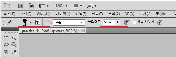 그래서 다음으로 할 것은 일단 연필의 크기와 불투명도를 50%로 주어서 반 투명하게 만드는 작업입니다. 여기서 신경써야 할 것은 일단 불투명도가 가장 크고, 연필의 크기는 상황을 봐 가면서 임의로 조정해도 됩니다.