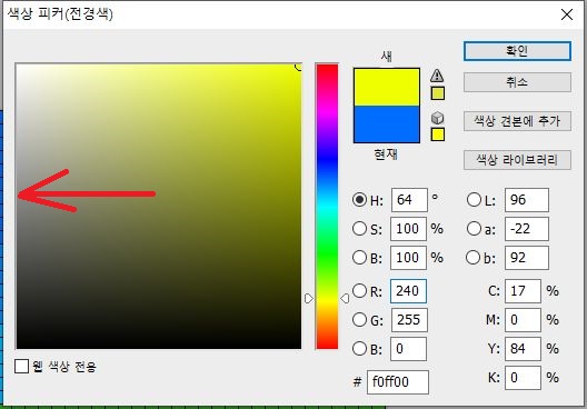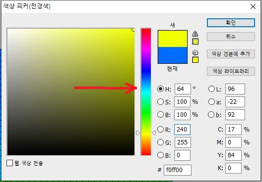 그리고 선명한 것과는 무슨 차이가 있는지는 모르겠습니다만, 일단 선택되어 있는 색상보다 더 밝은 색상의 색을 원하면 수직인 방향으로 위로 올리면 됩니다.