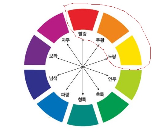 일단 맨 처음에 선택한 색상보다 더 선명한 색상을 원할 때는 보통 오른쪽 - 위 스크린샷의 화살표 방향으로 이동을 하면 됩니다.