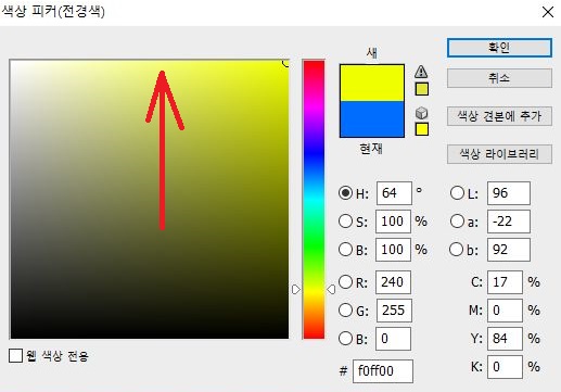 그리고 선명한 것과는 무슨 차이가 있는지는 모르겠습니다만, 일단 선택되어 있는 색상보다 더 밝은 색상의 색을 원하면 수직인 방향으로 위로 올리면 됩니다.