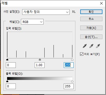 그리고 나서 이미지 메뉴에 있는 조정 아래에 있는 레벨 이라는 항목을 위 스크린샷처럼 일단 가지고 오도록 합니다. 이제 다음으로 가야 할 것은......