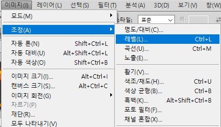 그리고 나서 이미지 메뉴에 있는 조정 아래에 있는 레벨 이라는 항목을 위 스크린샷처럼 일단 가지고 오도록 합니다. 이제 다음으로 가야 할 것은......