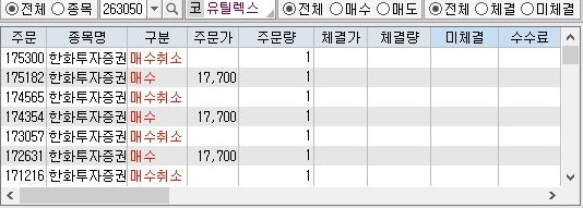먼저 위 스크린샷에서 볼 수 있는 것처럼 RSI지수를 기반으로 해서 나온 매수/매도 룰에서 하루종일 있었는 거래의 내용을 보여주고 있습니다.