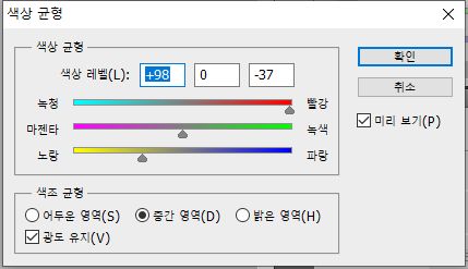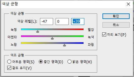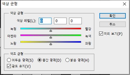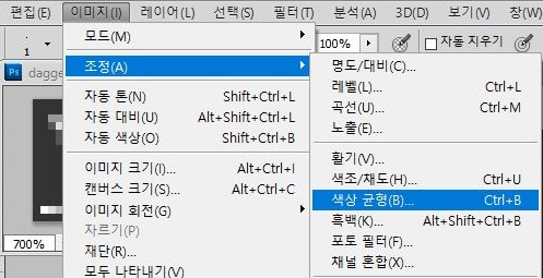 그리고 나서 다음으로 진행하고자 하는 것으로는 이미지 항목 안에 있는 색상 균형 항목을 일단 클릭해서 작업을 합니다. 아참, 그전에 이 흑백의 단검은 두고두고 사용될 것이기 때문에 레이어를 미리미리 복제하도록 합니다.