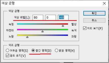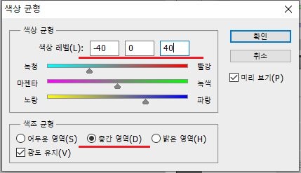 이미지 메뉴의 조정항목 안에 있는 색상균형을 가지고 와서, 색상레벨에서 제일 좌측부터 있는 빨강, 녹색, 파랑을 각각 -40, 0, 40으로 바꾸어 주도록 합니다. 그리고 나서 중간영역을 선택하도록 합니다.