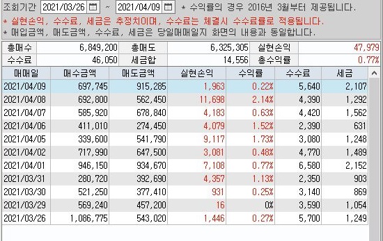 일단 이 실험이 시작된 3월 26일부터 한번 이야기를 시작해 보도록 합니다. 우선 위 스크린샷에서 볼 수 있는 것처럼 벌기는 4만 7천원을 벌었고, 손해는 지금 보유하고 있는 주식이 하락해서 1만원대 나왔으니, 얼추 3만원대의 수익을 올렸다고 할 수 있습니다.