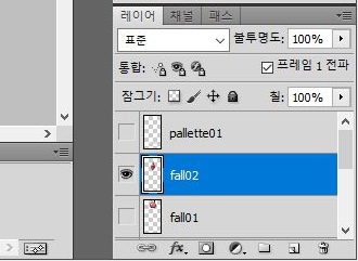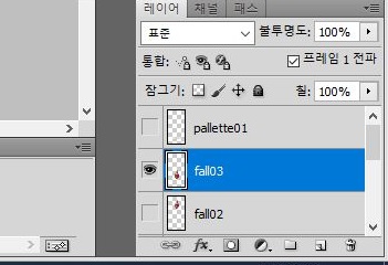 아무튼 이렇게 온 것을 fall03이라는 새로운 레이어로 만들어 주도록 합니다. 그리고 이전 프레임을 선택헤서 레이어를 어느것은 보이고 아니고를 지정하도록 합니다.