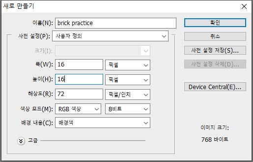 그래서 일단 16 X 16 픽셀의 캔버스를 하나 만들어 주도록 합니다. 이렇게 하는 것으로 일단 벽돌벽의 반복되는 패턴을 만들어 줄 기본 구조를 가지고 옵니다.