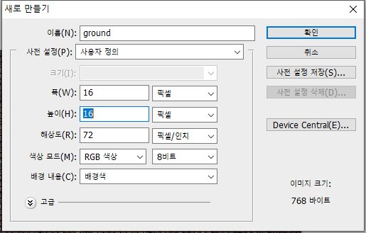 그리고 나서 한개의 타일을 만들어 내기 위해서 16 픽셀 X 16 픽셀의 자그만한 캔버스를 하나 만들어 주도록 합니다. 그리고 나서 이를 바탕으로 한번 움직여 보도록 합니다.
