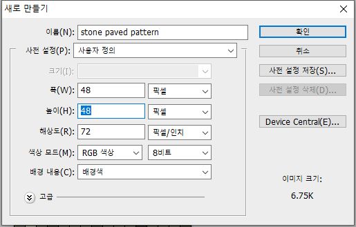 이제 패턴을 한번 알아보기 위해서 한번 작업을 해 보고자 합니다. 일단 48 X 48 픽셀 사이즈로 새로운 캔버스를 만들고, 이전 과정을 반복합니다.