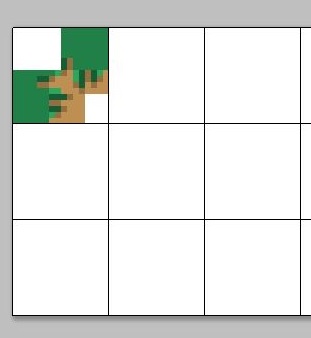 그래서 일단 다시 격자 간격을 1 픽셀로 줄인 다음에, 하나하나 수선을 들어가 도록 합니다. 그리고 나서 풀밭의 밝은 면과 어두운 면, 마지막으로 풀 그림자까지 어떻게 표현해 주도록 합니다.