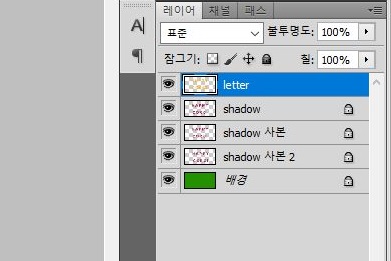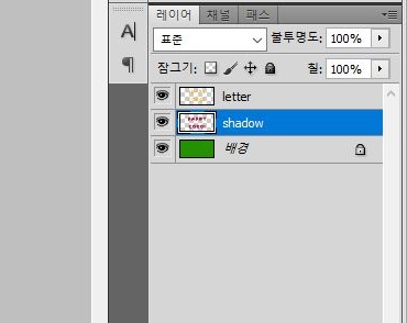 일단 여기까지 작업이 되었다면, 이제 문자와 그림자의 레이어까지 합쳐 주어서 하나의 레이어로 만들어 줍니다. 왜 이렇게 하느냐 하면, 다음 포스팅에서 나오는데, 바로 문자의 바깥으로 테두리를 주두록 할 것인데, 이런 효과를 주기 위한 밑작업이라고 할 수 있습니다.