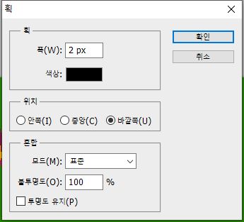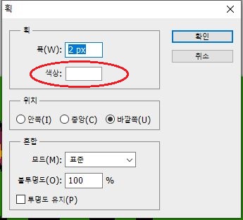 다시한번 획 메뉴를 열어서, 이번에는 하얀색 테두리를 만들어 보도록 합니다. 이렇게 해서 여전히 바깥쪽으로 어떻게 해주는 것으로 하면..........