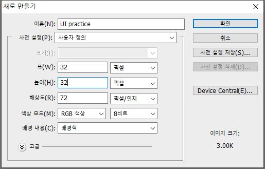 역시 이런 작업을 하기 위해서는 일단 32 X 32 필셀로 일단 위 스크린샷에서 볼 수 있는 것처럼, 일단 새로운 캔버스를 하나 만들어 주도록 합니다. 이렇게 하나 만들어 주고 나서는...................