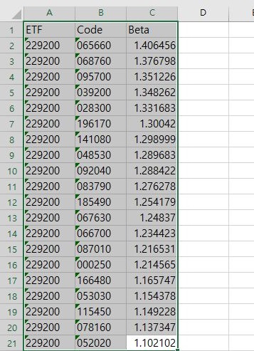 어떻게 코스피의 ETF에 대한 베타값을 구한 다음에, 이 값들을 우선 1.1 이상되는 값만 모아 보았습니다. 하지만 너무 많은 종목이 나오는 것이 문제이기 때문에...............