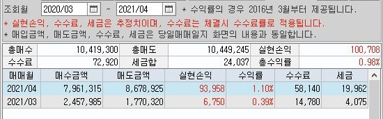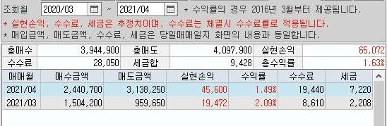 3월부터 4월까지 한달에 걸쳐있는 이 수익을 전체적으로 보면, 거의 10만원 조금 넘는 수익을 올렸습니다. 여기다가 3만 6천원대 손해를 빼도, 확실하게 수익이 올린 것은 맞기는 합니다.