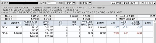 그리고 나서 월간 누적 수익률에 대한 영웅문 HTS의 윈도우를 열어서 본 결과인데, 일단 6만원이 넘는 수익을 거둔 것은 확실하게 맞기는 맞습니다.