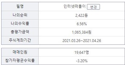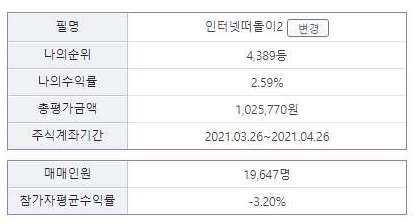 아무튼 지난주에 비해서 등수가 오르기는 했지만, 이건 그렇게 큰 의미가 없다시피 하고, 그 보다는 참가자 평균 수익률이 마이너스 대 인 것을 생각하면, 오히려 상당히 선전한 것이 아닌가 합니다.