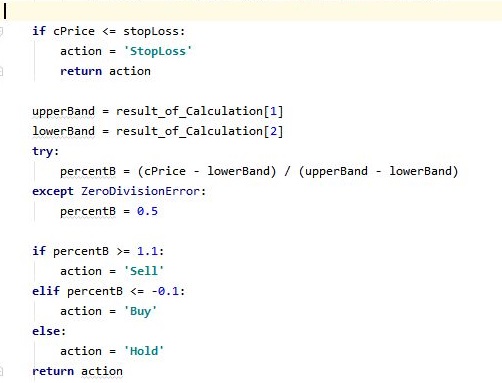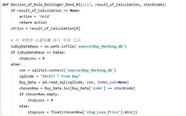 그리고 나서 계산된 볼린져 밴드 수치를 가지고서 한번 작업을 해보고자 합니다. 일단 이 작업을 하기 위해서는 위 스크린샷에서 볼 수 있는 것처럼, 일단 새로운 메서드를 작성해 주도록 합니다. 그러면서 손절매를 위한 부분도 잊지 말도록 합니다.