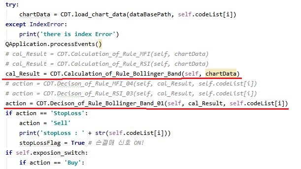 그리고 나서 계산된 볼린져 밴드 수치를 가지고서 한번 작업을 해보고자 합니다. 일단 이 작업을 하기 위해서는 위 스크린샷에서 볼 수 있는 것처럼, 일단 새로운 메서드를 작성해 주도록 합니다. 그러면서 손절매를 위한 부분도 잊지 말도록 합니다.
