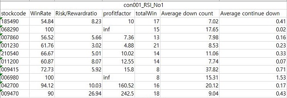 그리고 나서 평균이 된느 승률, 그리고 나서 매수 이후 하락하는 경우의 평균과, 그 경우가 연속해서 일어나는 연속성도 한번 비교를 해 보았습니다.