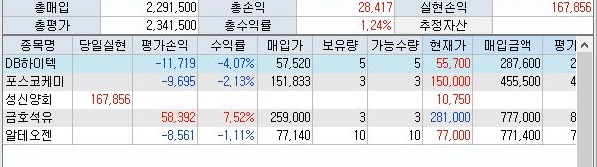 이날은 홈런은 아니지만 그래도 2루타 정도는 되는 안타를 친 날이기는 합니다. 위 스크린샷을 보시면 알 수 있듯이, 일단은 16만 7천원을 모의투자에서 벌기는 벌었습니다. 다만 이후에 총 손익이 6만원 대에서 줄어들기는 했는데, 다음주 월요일에 어떤 상승폭을 보여줄 수 있을 것으로 보여서 어떤 의미로는 기대가 되기도 합니다.