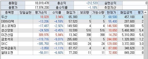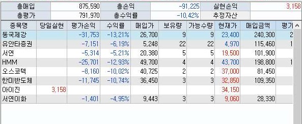 그리고 소소하지만 일단은 대조군에서 수익이 나오기는 나왔습니다. 일단 전체적으로 보유한 주가가 하락해서 생긴 손해는 9만원을 넘어가고 있습니다.