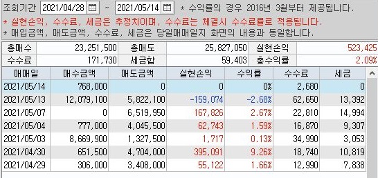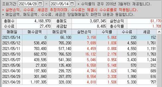 하지만 보유하고 있는 주식의 가치하락으로 인한 손해가 21만원인걸 생각하면, 어떻게 그걸 넘어가는 수익을 건진 것 같아 보이기도 합니다만, 한때 이게 90만원까지 손해가 올라간 것을 생각하면 그렇게 좋아할 수만은 없어 보입니다. 아무튼 이런 이유로 인해서 정말로 주식이란 알다가도 모르겠다는 생각이 듭니다.
