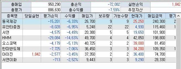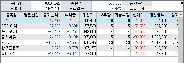 일단 이익을 내는데는 성공했습니다. 다만 문제라면 문제가 하나 있는게, 너무 보유하고 있는 주식의 가치가 내려가서, 이로 인한 손해가 크다는 것 입니다.
