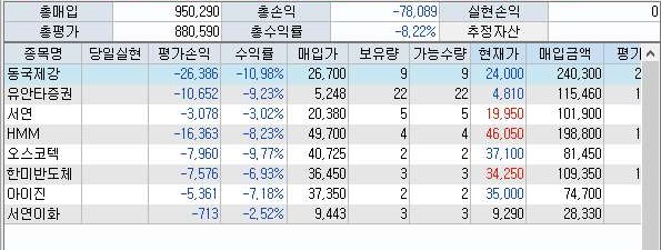 일단 여기서는 수익 5만원이 중요한 것이 아니라, 보유하고 있는 주식의 가치하락이 더 중요해지는 타이밍이 온 것 같습니다. 일단 여기서 매도로 수익을 올린 것은 좋은데, 문제는 매도하지 않은 다른 보유종목의 가치하락이 문제라는 생각이 드는데, 이에 대해서는............ 슬슬 처분모드를 On해야 할듯 합니다.