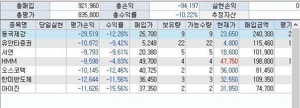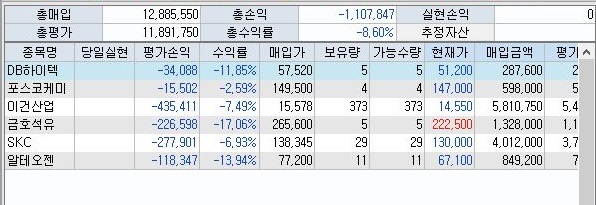 결국 이렇게 해서 엄청난 손해만 입으면서 그대로 마무리가 되는 상황을 맞이하고 있습니다. 이런 상황이 마음에 들지 않지만, 무슨 강제로 어떻게 되는 것이 없으니, 뭐라 말을 못하겠습니다. 아무래도 다음번에는 이런 보유중인 주식의 가치하락을 단순히 단일 종목에 대한 손절매 만이 아닌 다른 방식으로 측정해야 할지도 모르겠습니다.