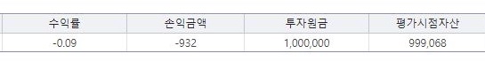결국 이제까지 꾸준하게 수익을 내 놓기는 했습니다만, 문제는 위 스크린샷에서 볼 수 있는 것처럼, 도합 6만8천원의 수익인데, 마지막에 보유중인 주식의 가치하락으로 인한 손실은 7만 5천원이 됩니다.