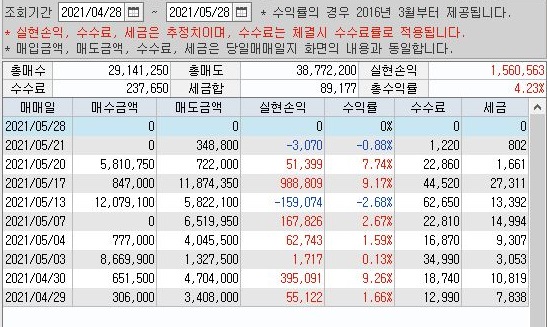 그리고 나서 다음으로 살펴본 것은 4월 28일 부터 계속해서 이어지고 있는 수익에 대한 것인데 여기서는 놀랍게도 생각외로 큰 수익을 내기는 냈었습니다. 즉 결론적으로 100만원은 넘게 나왔기 때문에 이익을 내기는 냈습니다.