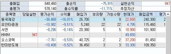 결국 이제까지 꾸준하게 수익을 내 놓기는 했습니다만, 문제는 위 스크린샷에서 볼 수 있는 것처럼, 도합 6만8천원의 수익인데, 마지막에 보유중인 주식의 가치하락으로 인한 손실은 7만 5천원이 됩니다.