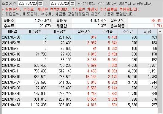 그리고 나서 다음으로 살펴본 것은 4월 28일 부터 계속해서 이어지고 있는 수익에 대한 것인데 여기서는 놀랍게도 생각외로 큰 수익을 내기는 냈었습니다. 즉 결론적으로 100만원은 넘게 나왔기 때문에 이익을 내기는 냈습니다.