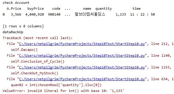 먼저 대조군을 움직이다ㅏ 이런 에러가 나오는 것을 봤습니다. 이게 무슨 문제인가 했더니, 너무 큰 자금 - 3000만원 자본금을 그렇게 다루어 본 적이 없다 보니, 4자리수의 주식을 사니까, 앞에 쉽표가 찍혀서 문제가 된 것 입니다.