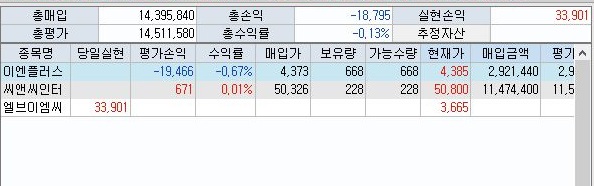 아무튼 하루종일 주식시장이 지나고, 위 스크린샷에서 볼 수 있는 것처럼 일단 실현손익으로 3만3천원을 번 다음, 다른 주식들도 가치가 오른 것을 확인할 수 있습니다.